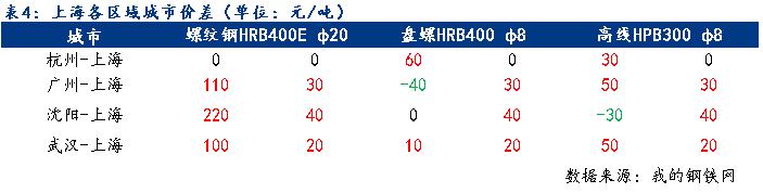 以主要品種螺紋鋼來看,上海市場與杭州價差日環比變化不大,價差持平。上海市場與東北區域價差小幅擴大,價差為220元/噸 。上海市場與華南區域價差環比小幅擴大,價差為110元/噸。上海市場與華中區域價差日環比小幅擴大 ,價差為100元/噸。