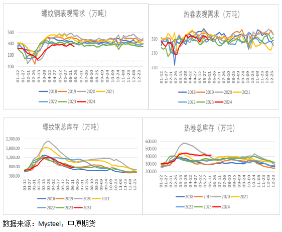 從鋼材供需基本面來看,當前隨著淡季需求下滑壓力逐步顯現,鋼材去庫進一步收窄。其中,螺紋鋼周度產增需減,產量較上周增加3.73萬噸,表需大幅下降28.27萬噸,目前供需仍呈現雙弱的格局,庫存降幅繼續趨緩,較上周下降10.43萬噸至773.67萬噸,其中廠庫下降0.47萬噸至202.38萬噸,較2023年同期下降10%,社庫下降9.96萬噸至571.29萬噸,較2023年下降2%。熱卷方面,本周產需雙雙回落,產量下降2.7萬噸,表需下降11.25萬噸,供需絕對值仍處于歷史同期中位水平。但庫存由降轉增,總庫存較上周增加6.07萬噸,社庫增加3.37萬噸,高出2023年同期23%,廠庫偏低,環比增加2.7萬噸至87.8萬噸,較2023年同期略增0.7%。基于需求回落,當前熱卷社庫壓力偏高,關注后續制造業補庫情況。螺紋鋼庫存壓力并未顯現,但需留意6月之后供需結構的變化,累庫拐點或將在6月中旬到來。