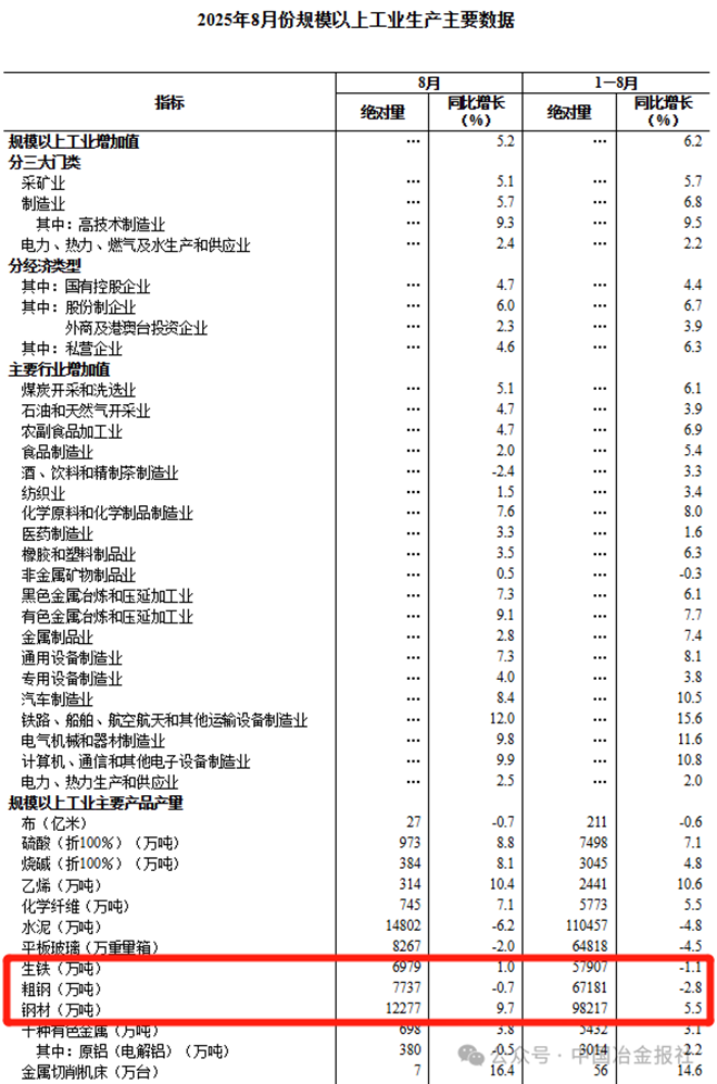 國(guó)家統(tǒng)計(jì)局公布的數(shù)據(jù)顯示:2025年8月份,中國(guó)粗鋼產(chǎn)量7737萬(wàn)噸,同比下降0.7%;生鐵產(chǎn)量6979萬(wàn)噸,同比增長(zhǎng)1.0%;鋼材產(chǎn)量12277萬(wàn)噸,同比增長(zhǎng)9.7%。