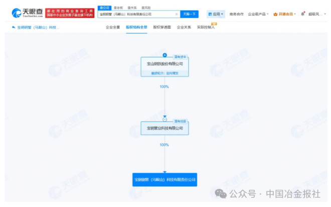 股權全景穿透圖顯示,該公司由寶鋼管業(yè)科技有限公司全資持股,后者為寶鋼股份全資子公司。