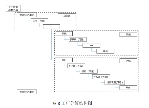 冶金工廠是多生產單元、多系統交叉的網狀結構,很難將每個工廠對象的位置信息準確表達。目前做法是對工廠逐層分解至生產單元、車間,車間內生產線分解至分區、機組、子機組、成套設備、設備單體,車間內系統分解至子系統、單體。如此,通過空間分解確定生產線設備唯一位置,通過系統分解確定公輔系統設備唯一位置。即根據空間布置或工藝流程,按照一定的分類原則和編碼體系進行組織,形成反映工廠對象的樹狀結構,這個樹狀結構稱之為工廠分解結構(PBS),工廠分解結構中的每個節點都是一個工廠對象,把這個節點按分類原則進行代碼化表達,就是工廠位置標識碼。工廠PBS分解結構如下圖所示: