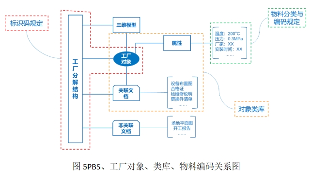 工廠標識碼、物料分類及屬性、類庫構成了數字化交付的數據基礎,其中,標識碼是工廠對象的唯一標識,物料編碼是工廠對象屬性的標準化表征,類庫是工廠對象的數據組織結構。工廠對象與PBS、類庫、物料編碼的關系如下圖所示[2]: