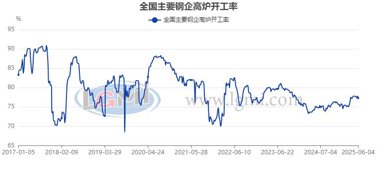 從月度高爐開工率變化來看,鋼鐵企業(yè)生產(chǎn)釋放呈現(xiàn)高位波動態(tài)勢。據(jù)蘭格鋼鐵網(wǎng)調(diào)研數(shù)據(jù)顯示,2025年5月份全國主要鋼企高爐開工率為77.7%,較上月均值上升0.1個百分點(詳見圖4);全國201家生產(chǎn)企業(yè)鐵水日均產(chǎn)量均值為234.1萬噸,較上月均值增加1.2萬噸。從鋼廠利潤情況來看,2025年5月份以來,鋼廠呈現(xiàn)了從品種盈虧不一到全面虧損的進(jìn)程,據(jù)蘭格鋼鐵研究中心測算,截至5月底,以兩周原料庫存測算的兩大主要鋼材品種處于全面虧損的局面,其中三級螺紋鋼虧損近30元,而熱卷虧損近100元。進(jìn)入6月份,由于季節(jié)性淡季效應(yīng)的不斷深入,鋼鐵企業(yè)的生產(chǎn)積極性由強轉(zhuǎn)弱,不論高爐開工率還是鐵水日均產(chǎn)量均小幅下降。